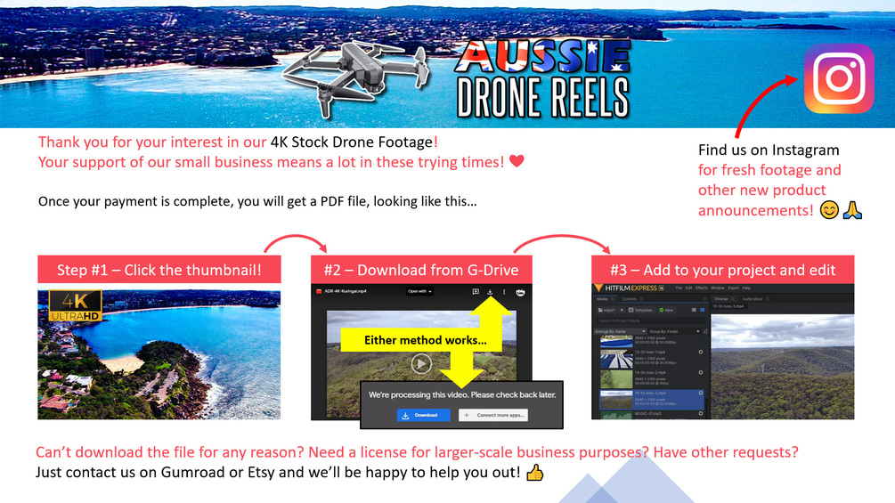 5. What happens after checkout? You'll be able to download a PDF with a secure link to download our original MP4 4K video footage from.